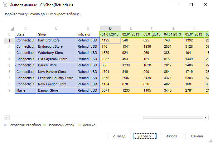Рассмотрим пример импорта данных, представленных в виде кросс-таблицы. Кросс-таблица - это способ представления данных, при котором информация о различных показателях располагается в заголовках строк и столбцов, а на пересечении строк и столбцов располагаются фактические данные. В примере импорта использован файл Microsoft Excel, данные в котором расположены в следующем виде: