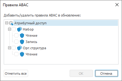 В структуре атрибутного доступа установите флажки напротив наборов политик и политик, которые должны быть добавлены в обновление. Для отметки всех элементов нажмите кнопку «Отметить все».