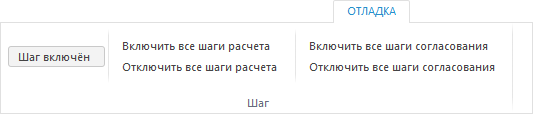 Для включения/отключения шага выделите его в рабочей области и измените состояние шага с помощью команды «Шаг включён» на вкладке «Отладка» ленты инструментов: