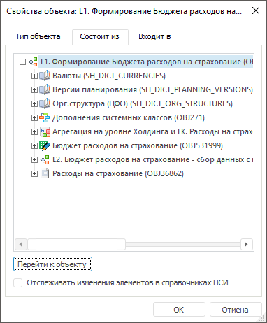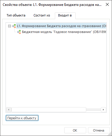 Для просмотра входящих в процесс объектов выделите объект и нажмите кнопку «Перейти к объекту».