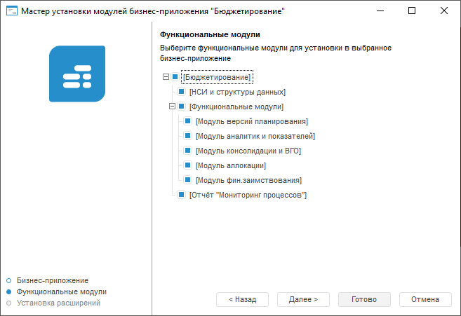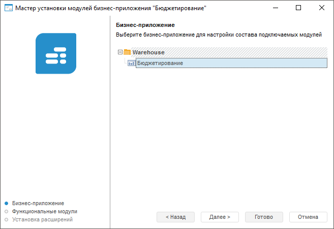 Установите функциональные модули бизнес-приложения «Бюджетирование» с помощью мастера.