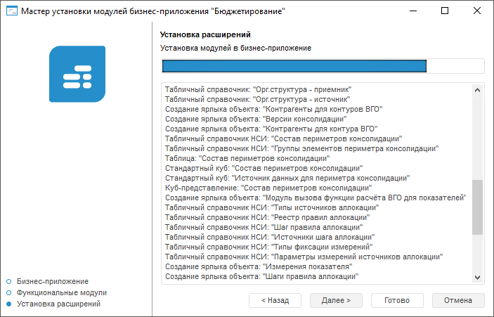 На странице «Функциональные модули» отметьте флажками модули для установки в выбранное бизнес-приложение и нажмите кнопку «Далее». По умолчанию отмечены все модули. После выполнения действий будет запущен процесс установки модулей: