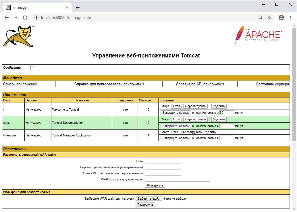 Укажите учётные данные администратора указанные при установке Apache Tomcat. После авторизации будет открыта страница:
