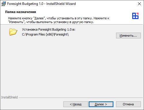 На следующем этапе установки необходимо определить папку, в которую будут установлены файлы серверной части. По умолчанию предлагается папка «C:\Program Files (x86)\Foresight\» или «C:\Program Files\Foresight\» в зависимости от разрядности операционной системы. Для изменения папки нажмите кнопку «Изменить». В выбранной папке при установке будет создан подкаталог «Budgeting 1.0»:
