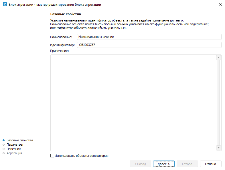 Настройка базовых свойств блока агрегации выполняется на странице «Базовые свойства» в мастере редактирования блока агрегации: