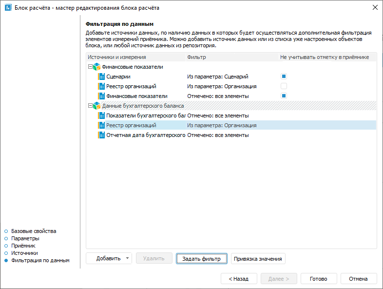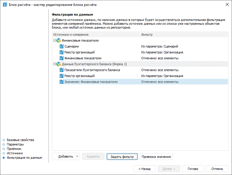 Настройка фильтрации по данным выполняется на странице «Фильтрация по данным» в мастере редактирования блока расчёта: