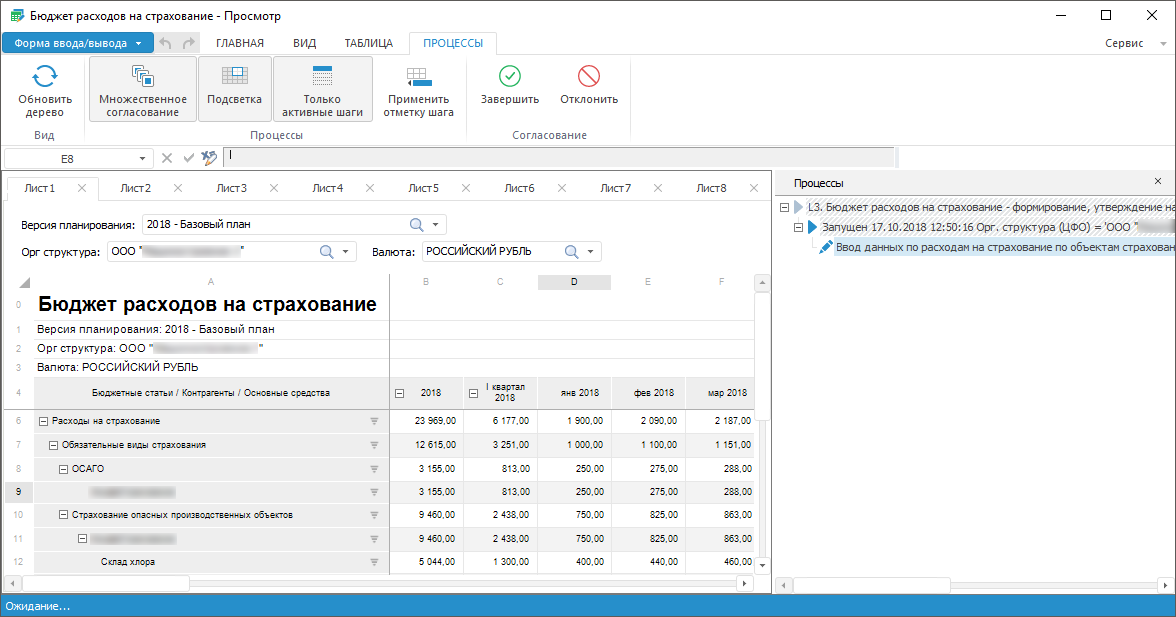 Для корректного отображения дерева процессов в форме ввода отметка по измерениям объекта полномочий должна полностью содержаться в отметке по измерениям формы ввода, используемой в шаге процесса. В дереве процессов отображаются только запущенные шаги процессов, доступные для пользователя в данной форме ввода. Если форма не указана в шаге процесса, то панель будет пустая.