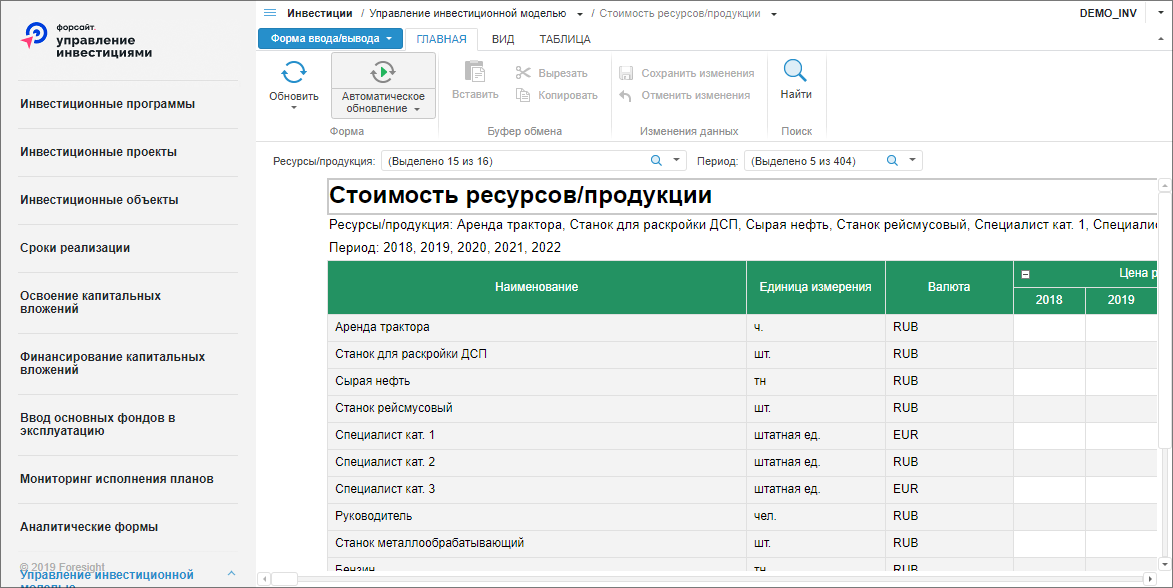 Ввод данных по ценам ресурсов/продукции