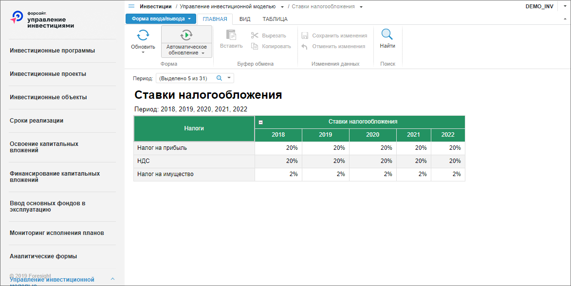 Ввод данных по ставкам налогообложения выполняется аналогично вводу данных в форму «Ставки дисконтирования».