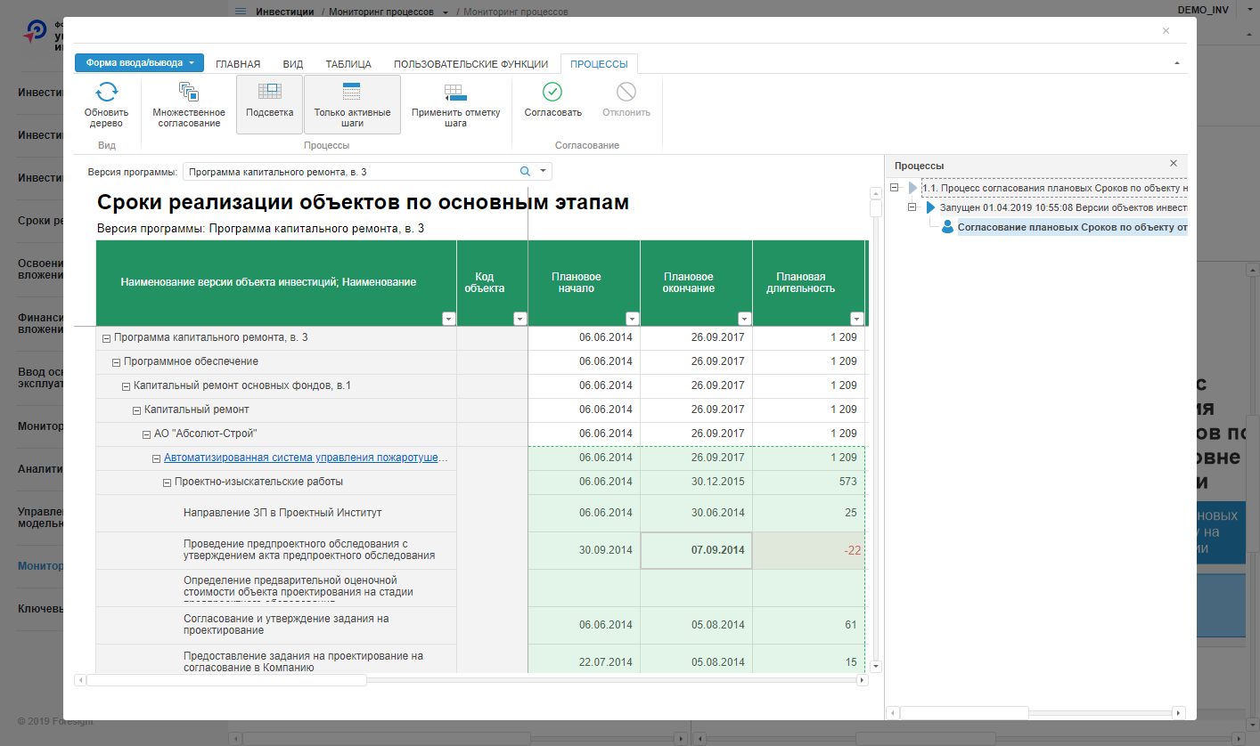 Окно формы «Сроки реализации объектов по основным этапам», открытое в веб-приложении: