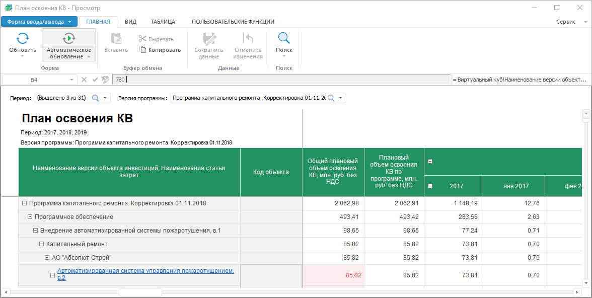 Форма содержит таблицу с информацией по плану освоения денежных средств по всем объектам, включённым в версию программы. Период и версия программы выбираются при открытии формы и могут быть изменены с помощью изменения отметки в параметрах формы.