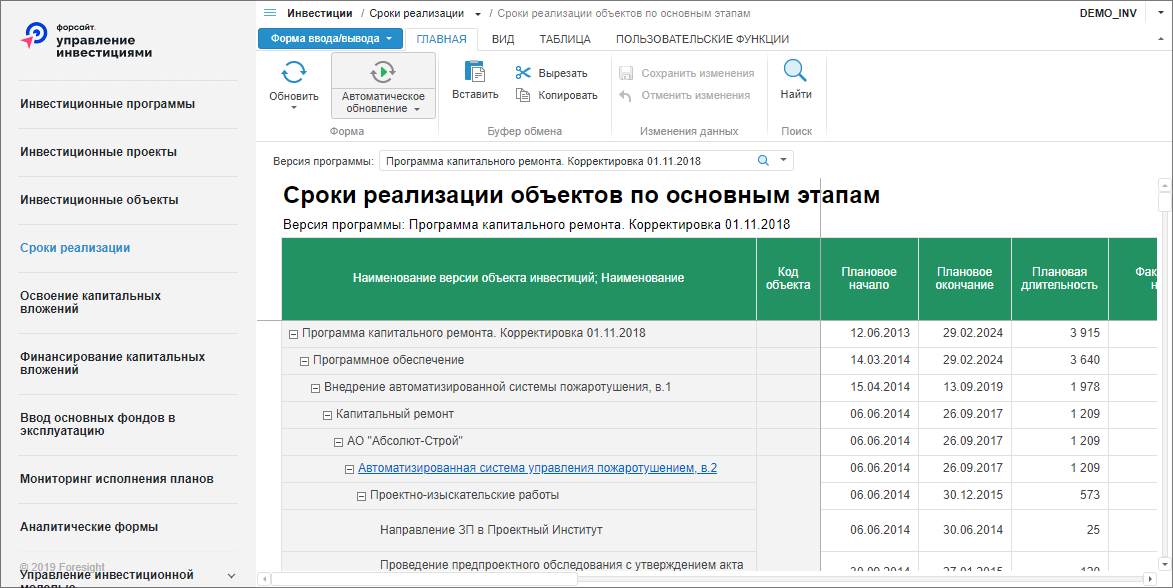 Выберите пункт бокового меню и форму, например, «Сроки реализации - Сроки реализации объектов по основным этапа».