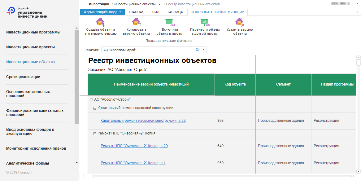 Форма ввода «Реестр инвестиционных объектов» предназначена для формирования списка инвестиционных объектов и его версий по выбранному заказчику.