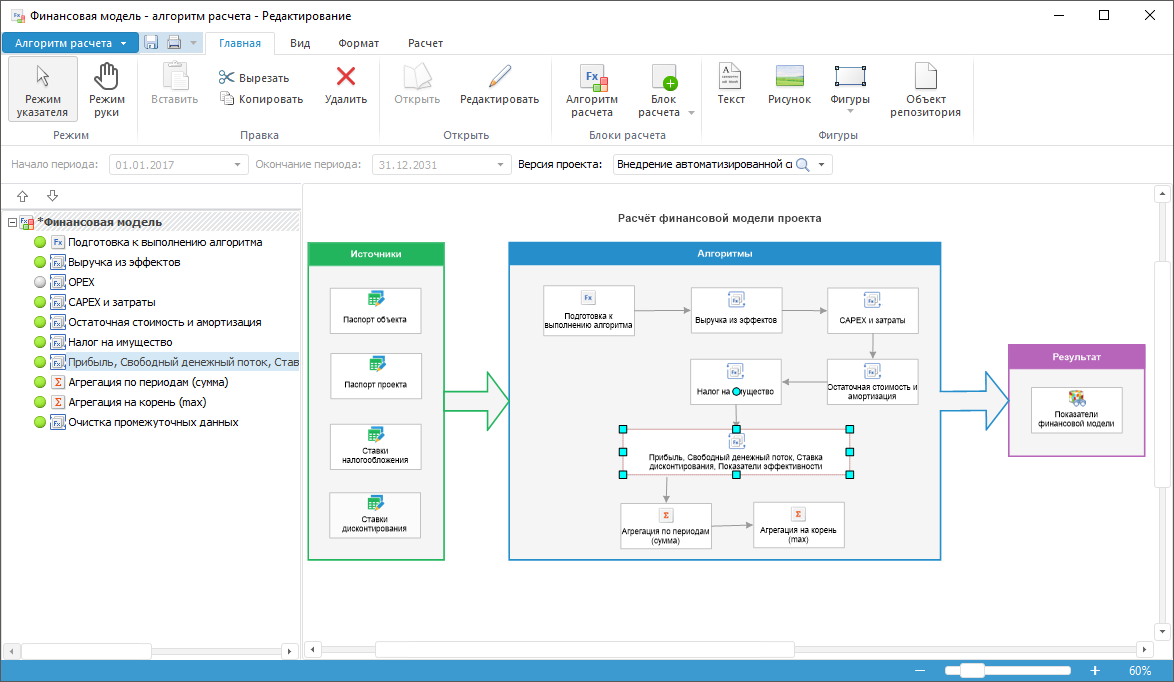 Алгоритмы расчёта. Служат для задания правил расчёта инвестиционных показателей. Алгоритмы могут быть прикреплены к формам ввода в качестве алгоритмов, применяемых для операций сохранения, изменения или контроля данных. Также алгоритмы могут быть интегрированы в бизнес-процессы в качестве шагов процессов;