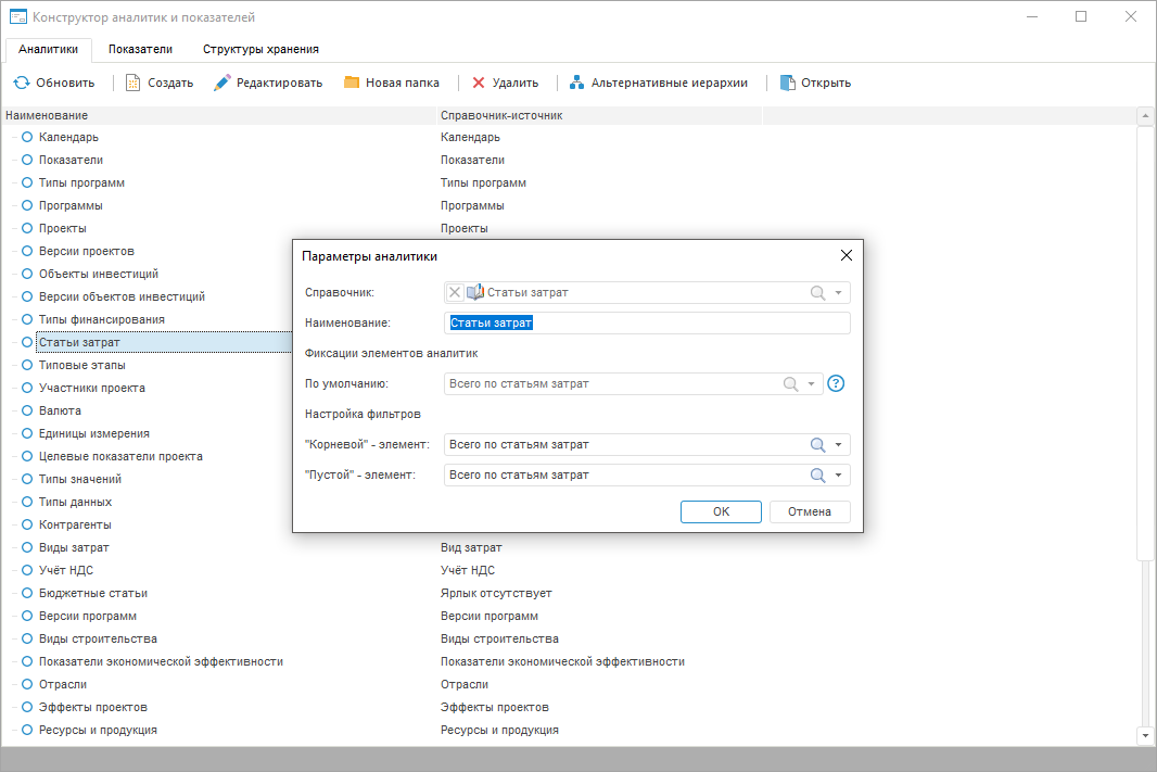 Примечание. При создании инвестиционных показателей автоматически создаются структуры хранения для показателей. Преднастроенные показатели и структуры хранения размещены в соответствующих папках корневой папки «02. Структуры данных и показатели» настольного приложения продукта