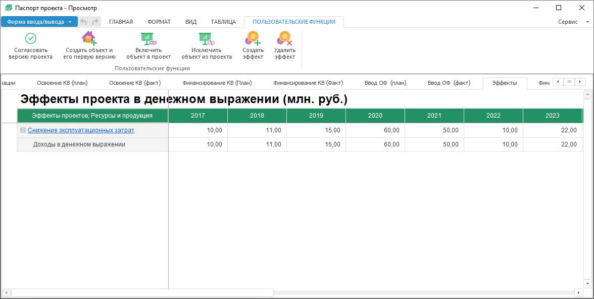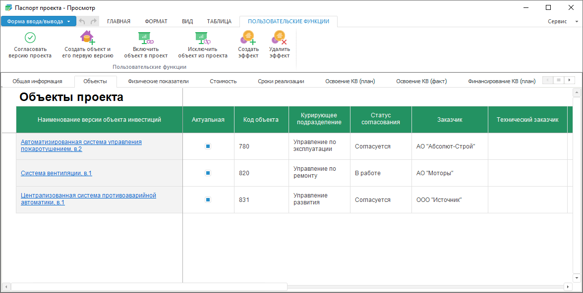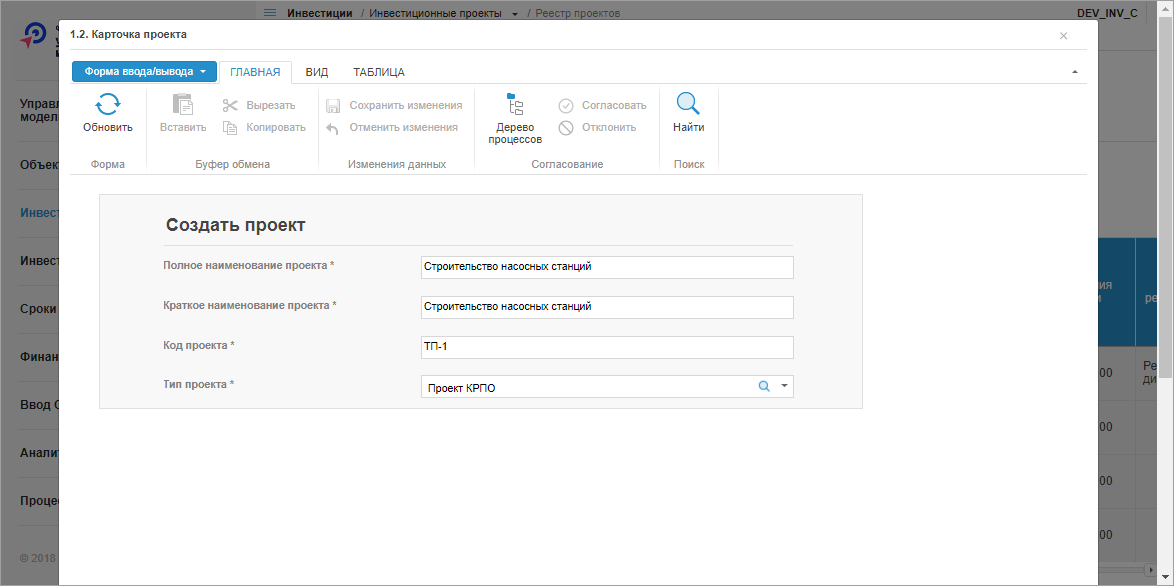 Реестр проектов представляет собой форму ввода, содержащую список всех инвестиционных проектов и их версий.