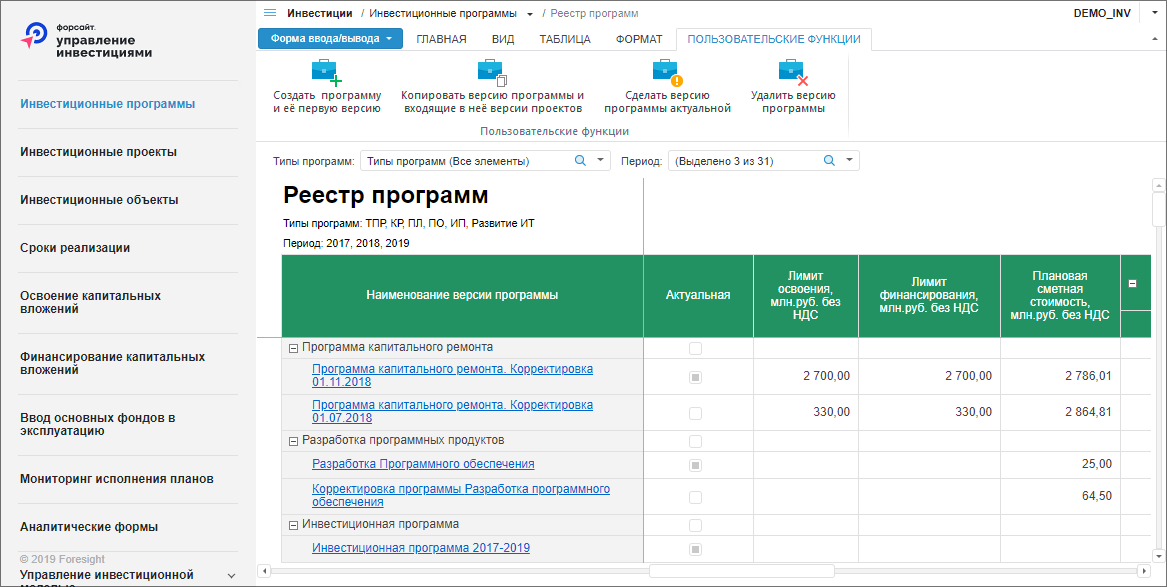 Форма ввода «Реестр программ» предназначена для формирования списка версий инвестиционных программ для заданного периода.
