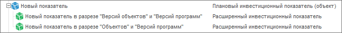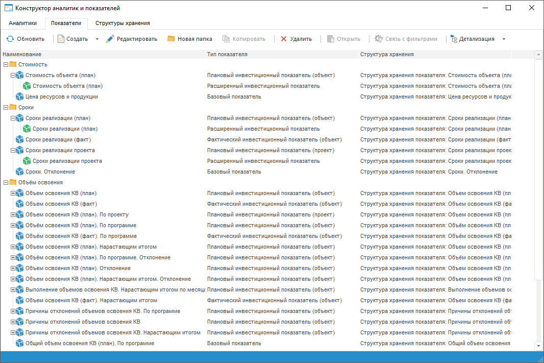 Показатели - наборы данных, объединенные общими аналитическими признаками, служащие для сбора, хранения и отображения информации об инвестиционной деятельности предприятия. В навигаторе объектов показатели представлены в виде преставлений кубов. Многомерная структура показателя состоит стандартного куба, в качестве измерений которого используются аналитики. Каждая аналитика связывается с источником данных, где в последствии будет храниться информация.