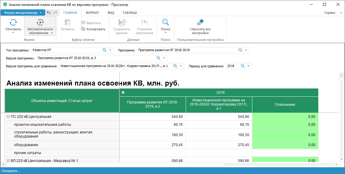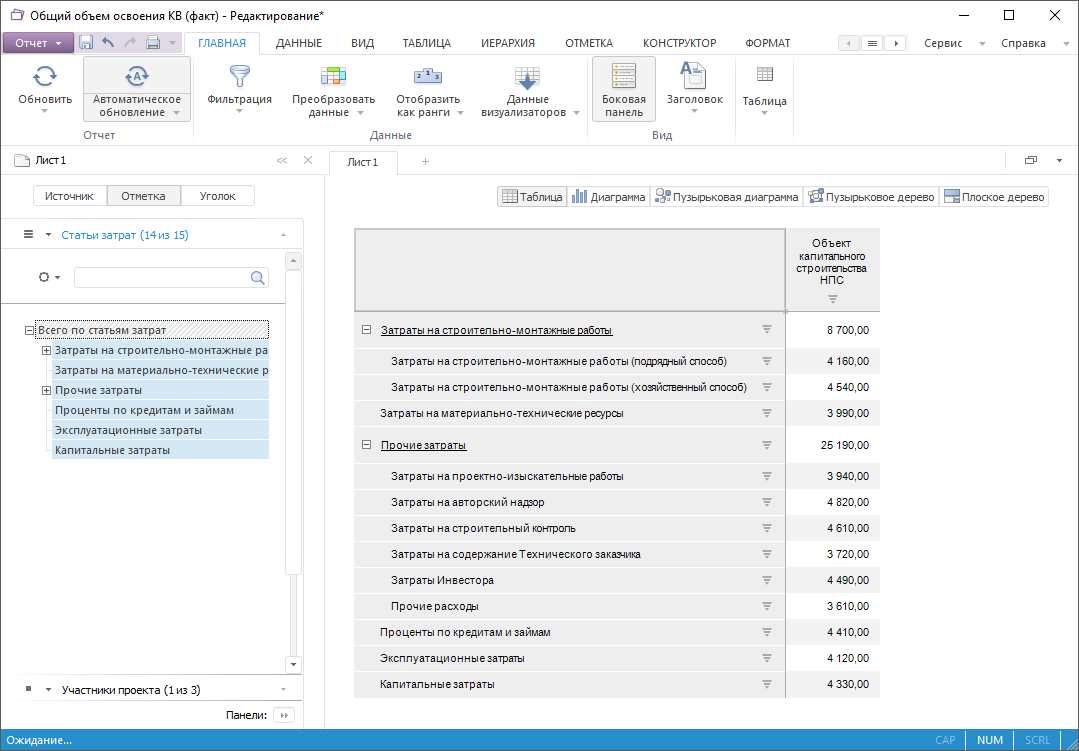 В рабочей области конструктора выводятся базовые и производные показатели, плановые и фактические инвестиционные показатели, а также расширенные инвестиционные показатели.
