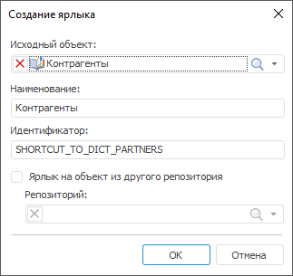 Для добавления ярлыков в навигаторе объектов бизнес-приложения: