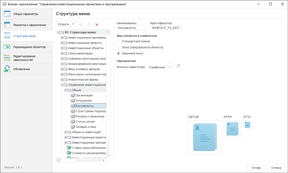 Примечание. Создание структуры и редактирование наименований пунктов бокового меню может выполняться в навигаторе объектов бизнес-приложения в папке «07.Структура меню» стандартными инструментами платформы.
