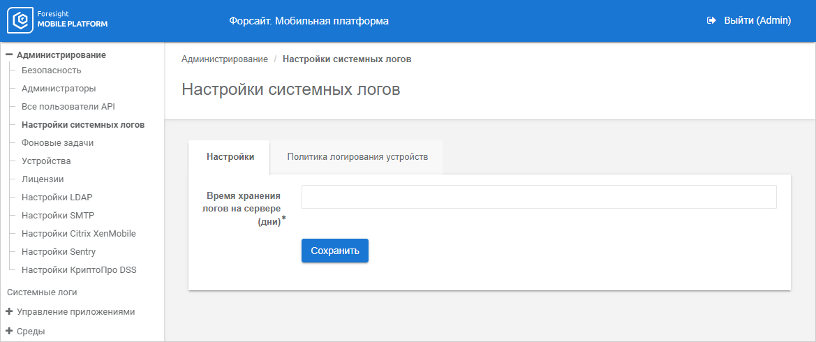 Для настройки параметров хранения логов на сервере мобильной платформы используйте вкладку «Настройки» в подразделе «Настройки системных логов»: