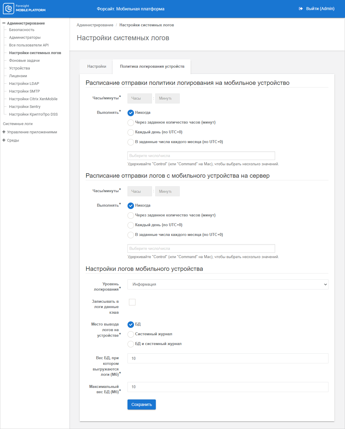 Для настройки параметров логирования используйте подраздел «Настройки системных логов». Параметры предназначены для настройки логирования на сервере мобильной платформы и на мобильном устройстве.