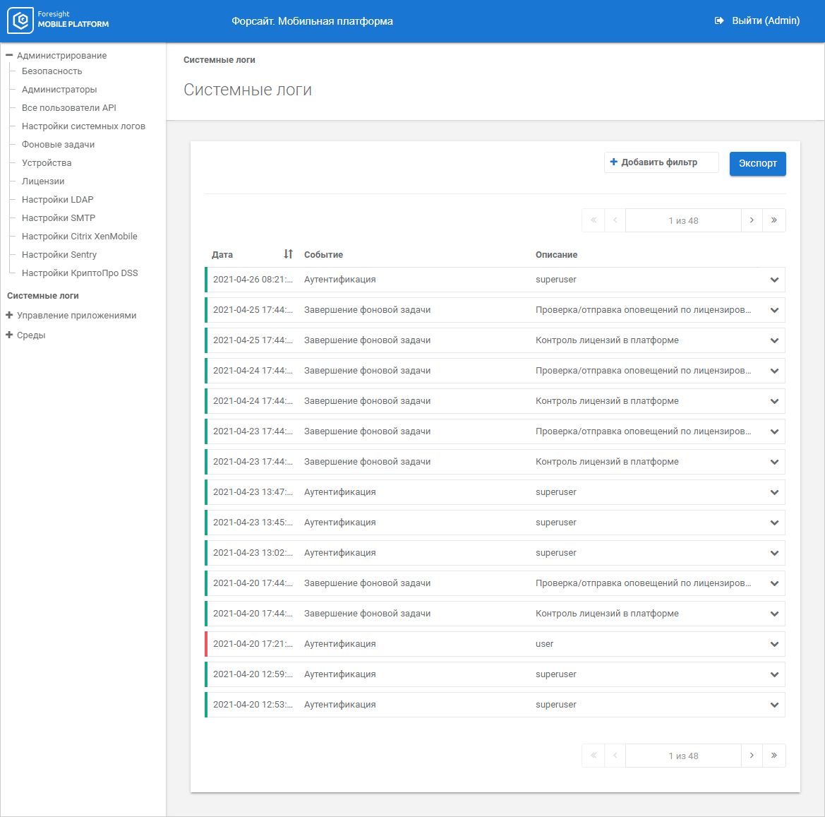 просмотр и настройка системных логов. Журнал с системными логами, идентифицирующий события, время и результат работы с сервером мобильной платформы;