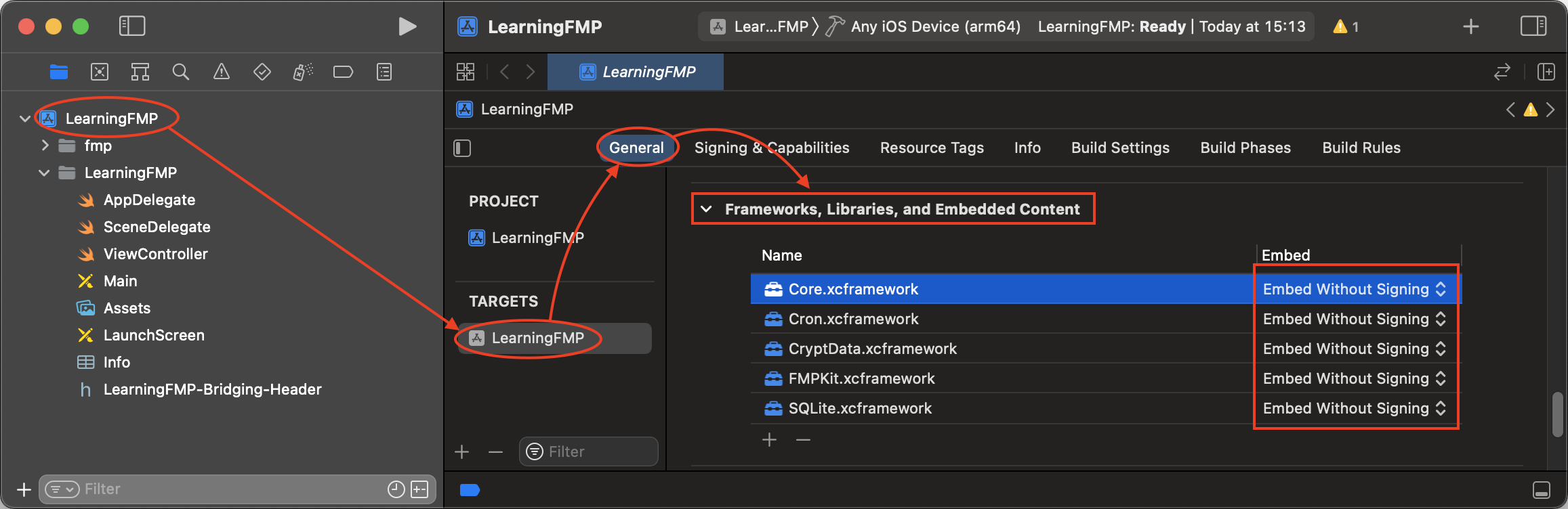 Выполните шаги 1-3 для добавления файла FMPWrapper.framework. Файл фреймворка добавляется аналогично добавлению файла HHFW.framework.