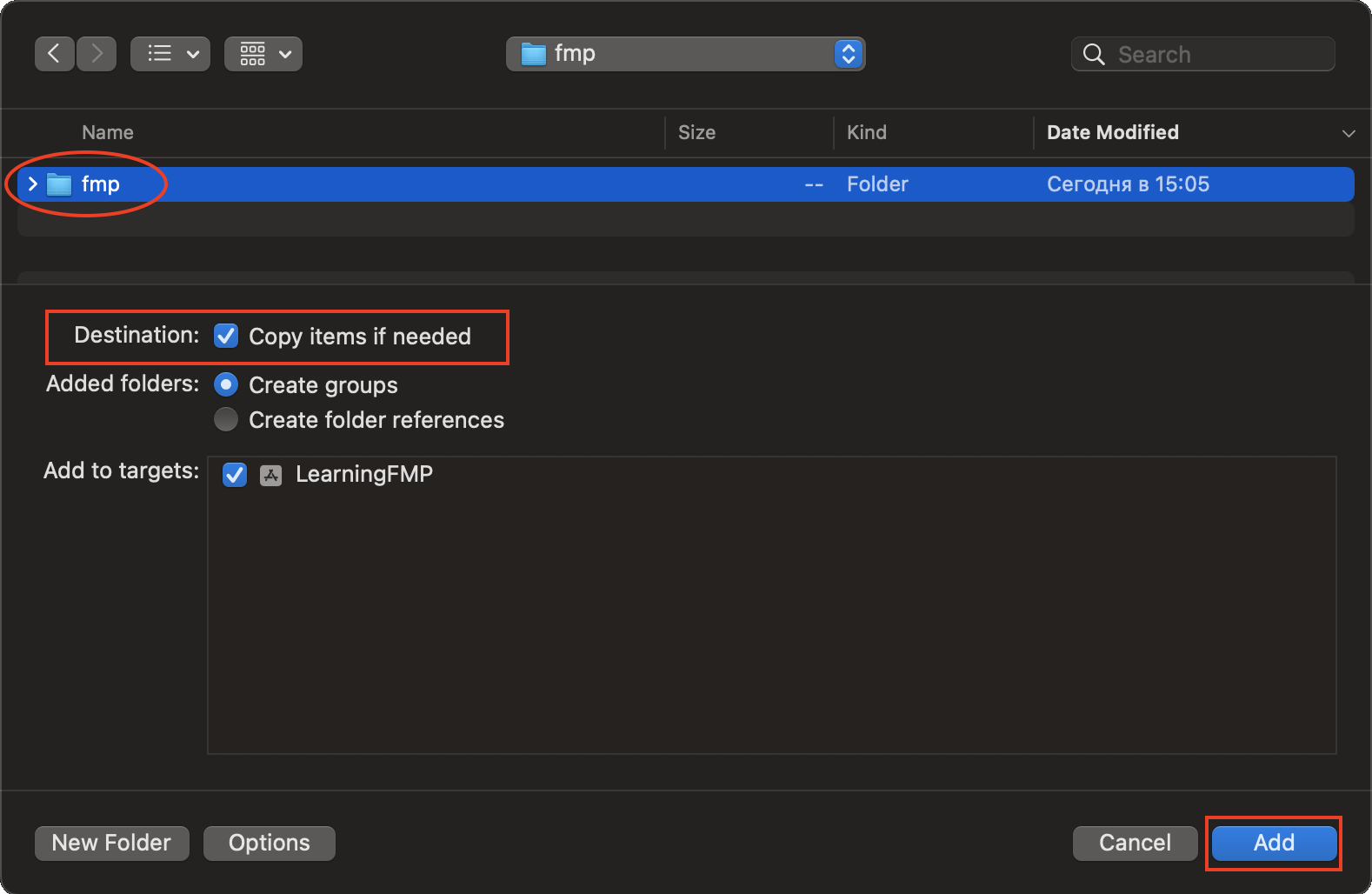 После чего будет открыто стандартное окно выбора файла. Выберите папку fmp, установите флажок «Copy items if needed» и нажмите кнопку «Add»: