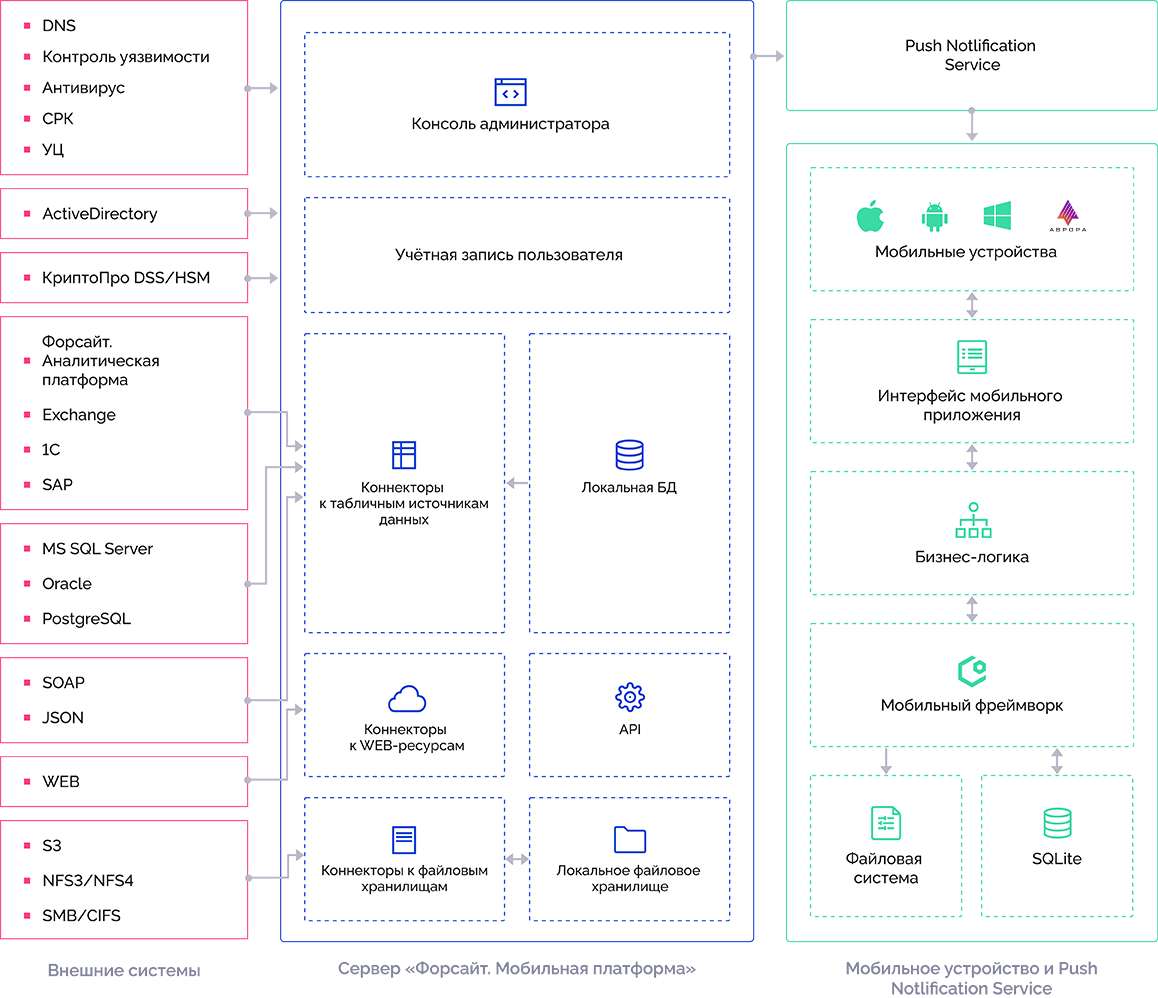 Функциональная архитектура программного продукта основана на подключении источников данных к серверу мобильной платформы и синхронизации с мобильными устройствами через Framework мобильного приложения.