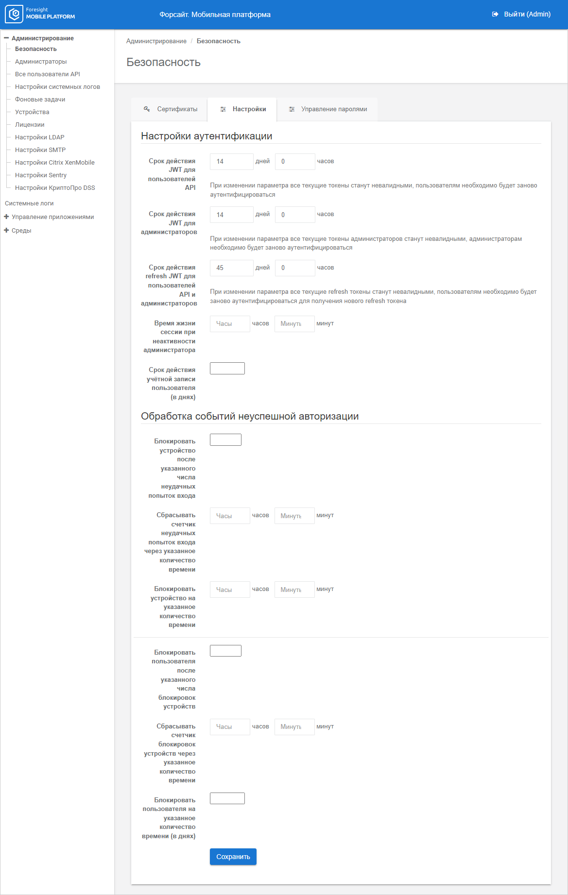 Примечание. Срок действия refresh JWT должен превышать срок действия JWT-токена для пользователей API и администраторов. При изменении срока действия JWT-токена или refresh JWT все текущие токены будут недействительны, субъектам необходимо заново выполнить аутентификацию.