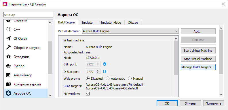 В настройках QT Creator найдите пункт Аврора ОС, нажмите