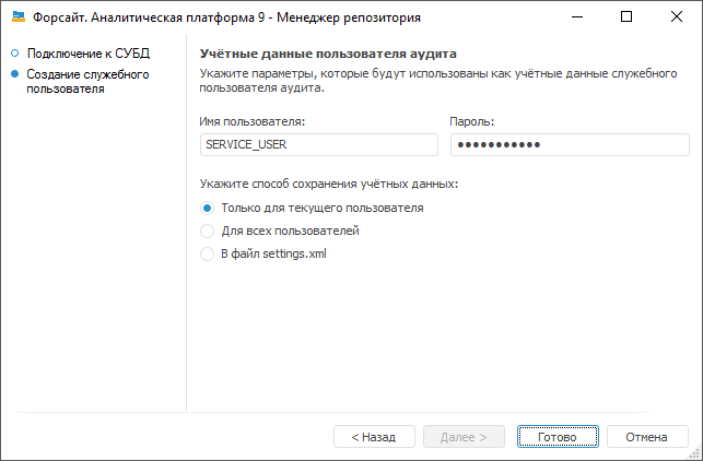 Примечание. Создание служебного пользователя необходимо только для репозитория, созданного на базе СУБД Oracle, Microsoft SQL Server, PostgreSQL, и доступно администратору/пользователю с привилегиями «Создание и удаление пользователей» и «Применение прав на уровне СУБД».
