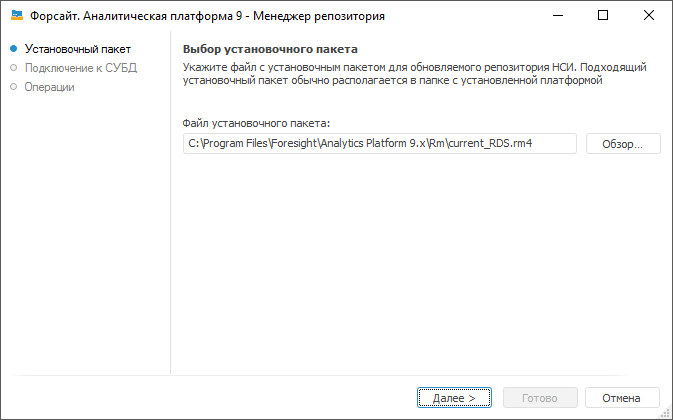Автоматически будет выбран путь к файлу с расширением *.rm4, в котором хранятся исполняемые скрипты. Данный файл входит в стандартный установочный пакет и находится по пути «S\Rm\current_RDS.rm4», где S - путь до места установки «Форсайт. Аналитическая платформа».