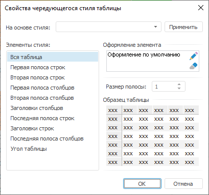Пользовательские стили таблицы доступны в настольном приложении и настраиваются при помощи диалога «Свойства чередующегося стиля таблицы».