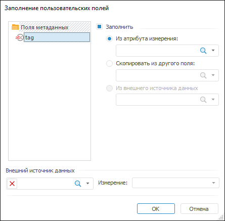 для задания значений пользовательских полей на базе значений каких-либо атрибутов измерений нажмите кнопку «Заполнение пользовательских полей». Будет открыто одноименное диалоговое окно: