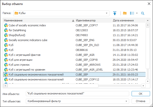 Из раскрывающегося списка выберите стандартные кубы или базы данных