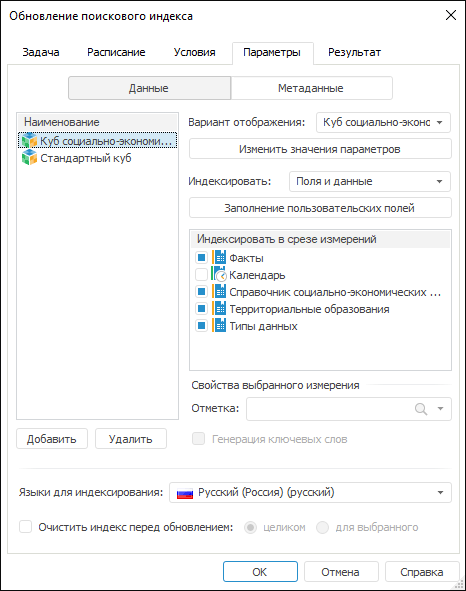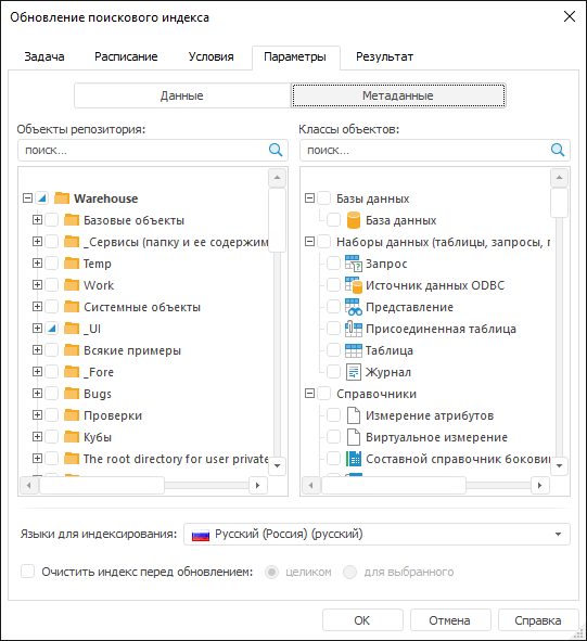 Задача обновления поискового индекса используется, если в репозитории настроен BI-поиск. При настройке задачи на вкладку «Параметры» добавляются дополнительные параметры: