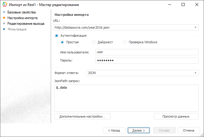 В поле «URL» укажите адрес REST-сервиса, который предоставляет данные (в текущей реализации поддерживается подключение к REST-сервисам, предоставляющим данные в форматах JSON и XML).