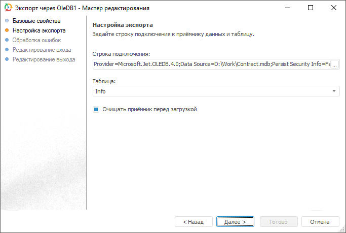 Коннектор «OLE DB» - объект, предназначенный для экспорта данных в БД с использованием драйверов OLE DB.