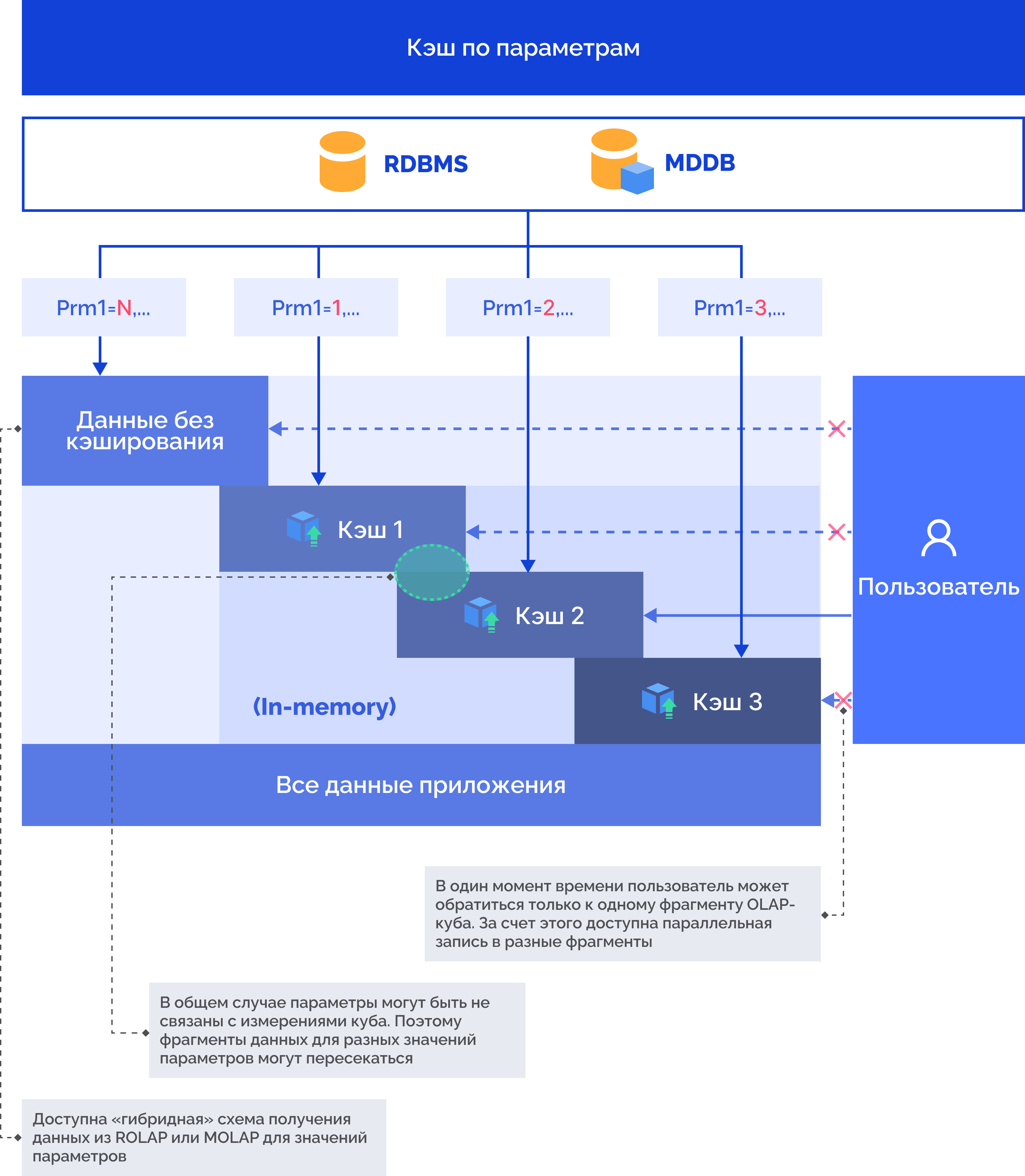 При использовании режима загрузки кэша по параметрам матрица данных разделяется параметрами на несколько частей. Загрузка кэша в оперативную память может выполняться частями в параллельном режиме. Разделённый по параметрам глобальный кэш рассматривается как отдельные подматрицы данных, и в один момент времени разные пользователи могут изменять данные в разных подматрицах не мешая друг другу. Для режима загрузки полного кэша такое невозможно и все изменения будут вноситься последовательно, так как индексация уникальности данных в матрице общая.