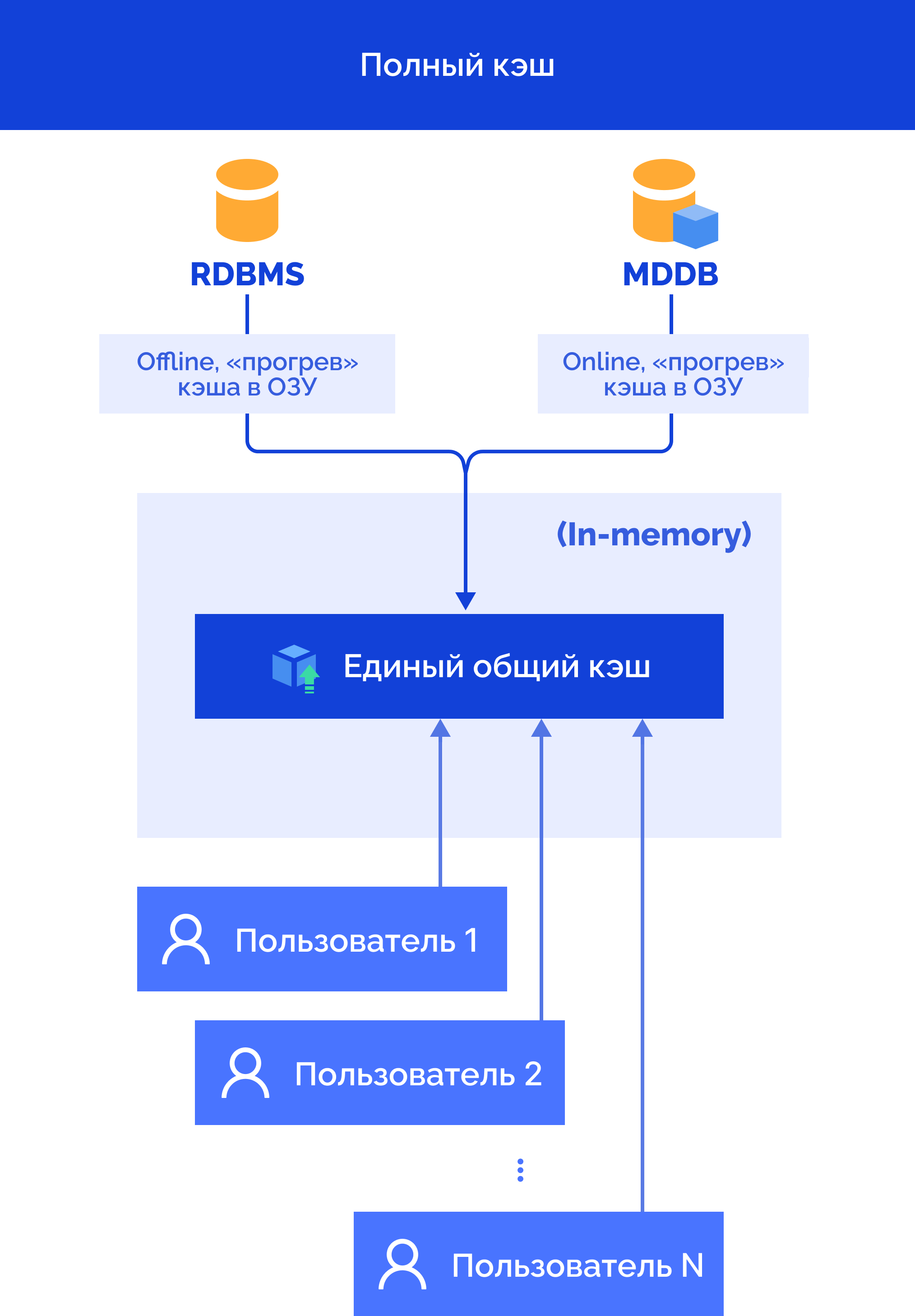 При использовании режима загрузки полного кэша выполняется загрузка всех данных из БД в оперативную память на BI-сервер в виде матрицы данных, единой для всех сессий пользователей.
