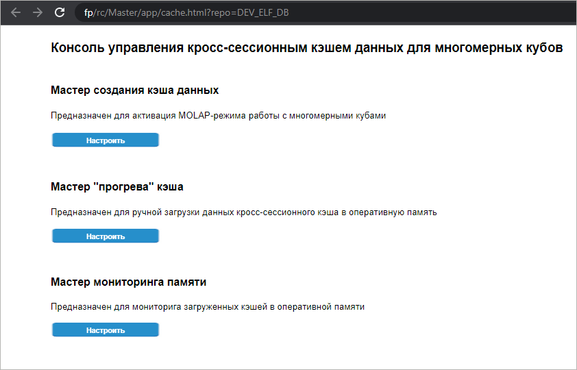Для создания кэша данных и выбора объекта кэширования нажмите кнопку «Настроить» в области мастера создания кэша на стартовой странице консоли.