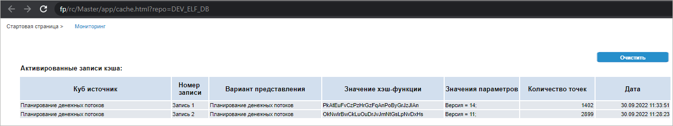 На странице будет отображён список записей кэша, которые в текущий момент загружены в память. Для очистки матрицы с данными у какой-либо записи кэша выделите её и нажмите кнопку «Очистить». Сама запись при этом остаётся загруженной, но количество точек для неё будет равно нулю.