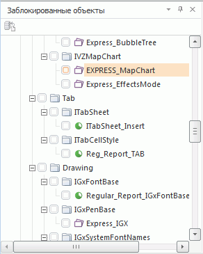 На панели отображается иерархический список заблокированных объектов репозитория.