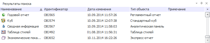На панели отображаются все объекты, удовлетворяющие условиям поиска.