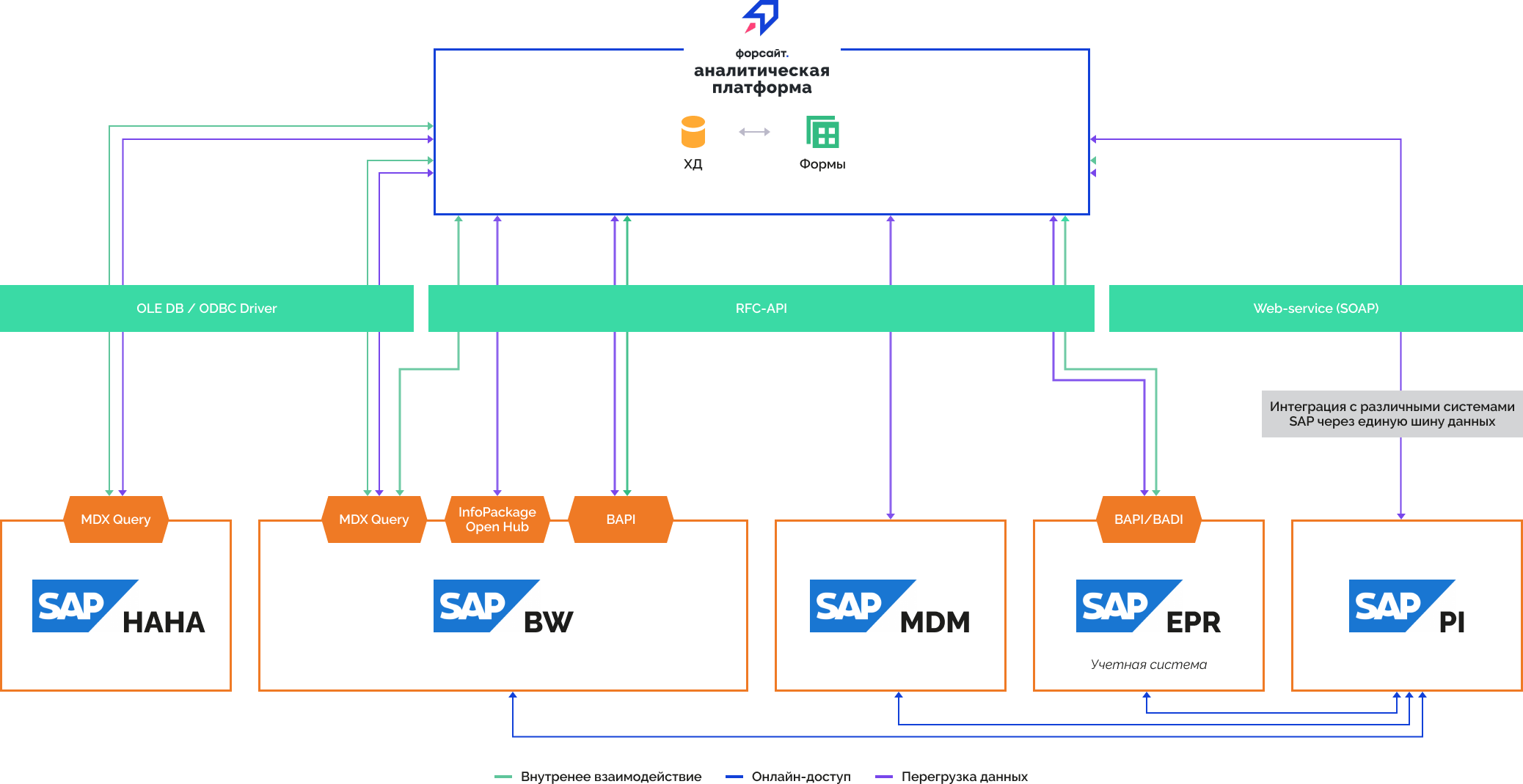 Продукт «Форсайт. Аналитическая платформа» позволяет настроить взаимодействие с различными продуктами и платформами SAP. В общем виде схема интеграции выглядит следующим образом: