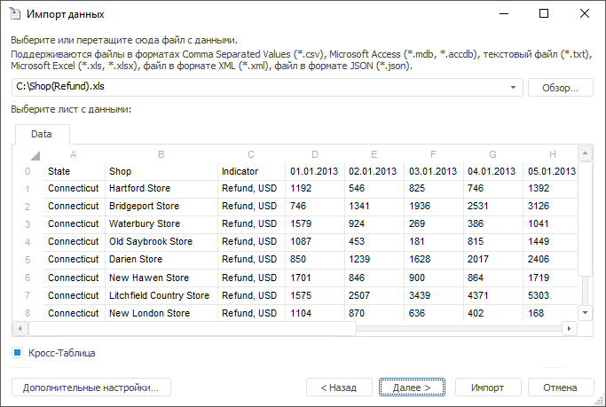 Если флажок «Кросс-таблица» установлен, то будут отображены дополнительные страницы мастера, позволяющие произвести настройку и идентификацию данных в кросс-таблице. Кросс-таблица - это сводная таблица, в которой заголовки могут располагаться как по строкам, так и по столбцам, позволяя таким образом отразить взаимосвязь двух и более переменных между друг другом.