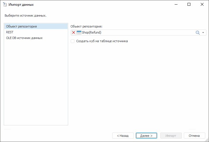 источника» позволяет создать стандартный куб с привязкой к